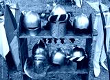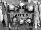 Six medieval knight helmets on a wooden shelf.