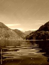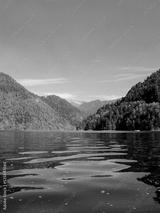 A beautiful lake in the mountains, the water surface reflects the mountains and the forest.