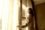 Happiness Asian woman open curtains for looking beautiful view outside her room.