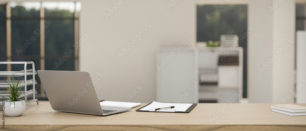 Modern office desk workspace with laptop, office accessories and space on wooden tabletop