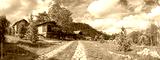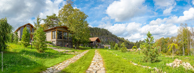 Modern village. Real estate in ecologically clean place. Panorama with rural town houses. Wooden cottages at foot hill. Summer landscape ECO village. Stone path leads to summer houses. ECO property