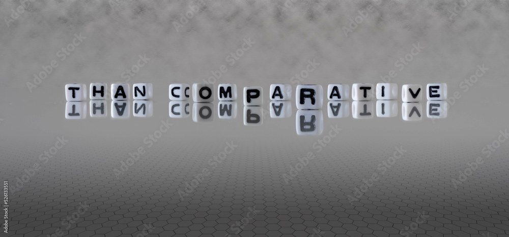 than comparative word or concept represented by black and white letter cubes on a grey horizon background stretching to infinity