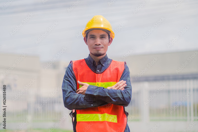 Asian Engineer construction confident on site building and Survey civil architect by contractor business with safety helmet factory background