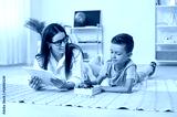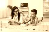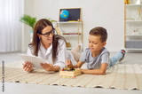 Speech therapist working with a child. Happy young woman with a clipboard and a little boy with ABCs lying on the floor, talking, learning letters and having fun. Education and speech therapy concepts