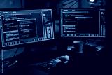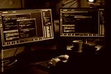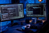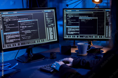 cybercrime, hacking and technology concept - close up of female hacker in dark room writing code or using computer virus program for cyber attack