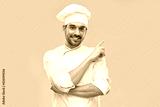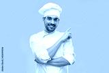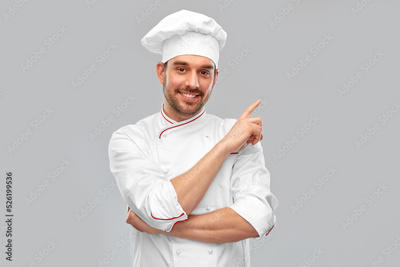cooking, culinary and people concept - happy smiling male chef in toque pointing to something over grey background