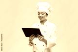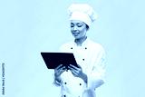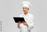 cooking, culinary and people concept - happy smiling female chef with tablet pc computer over grey background