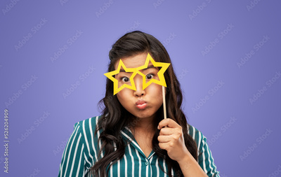 party props, photo booth and people concept - woman with big glasses in shape of stars over violet background
