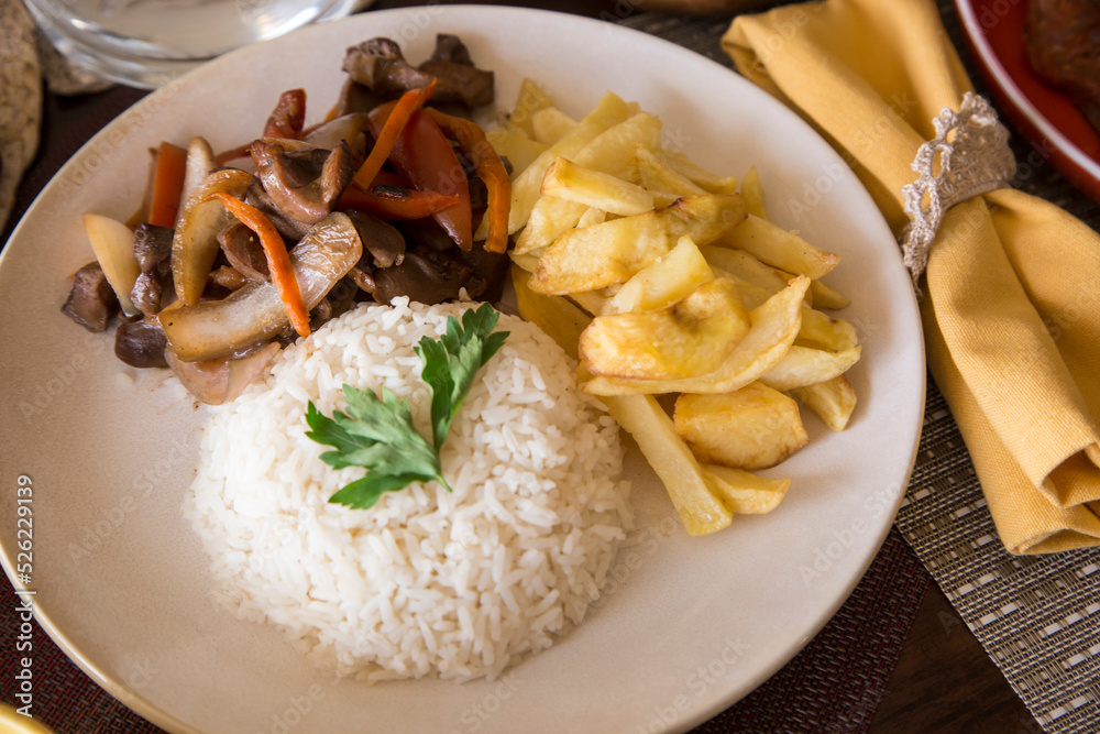 lomo saltado sauted meat french fries peruvian gourmet restaurant comfort food