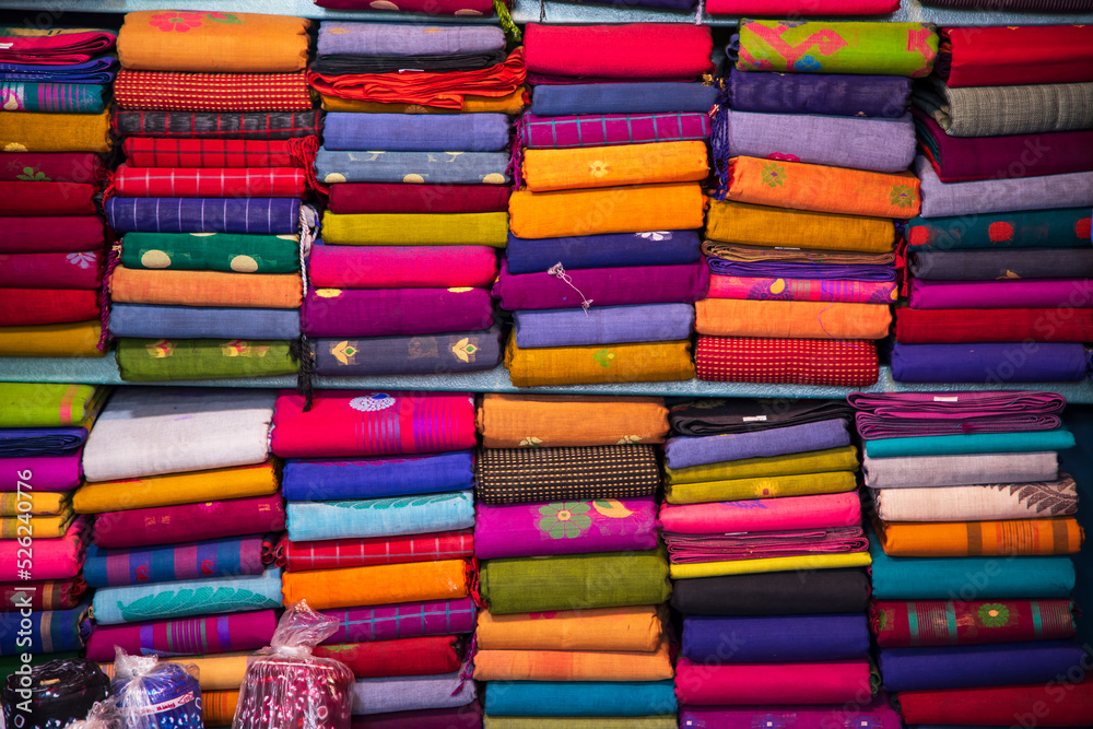 Artistic variety shade tone colors Saree's stacked on retail Shop Shelf to sale