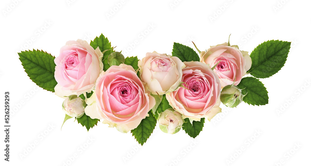 Small pink rose flowers and green leaves in a floral arrangement isolated