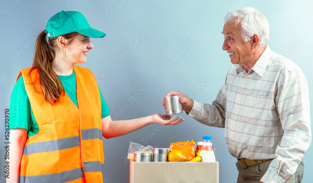 Help Collection Center, free food distribution. Volunteers wearing uniform green caps, t-shirts, orange vests prepare a food package grocery set for in-need people, sort, collect food donation boxes