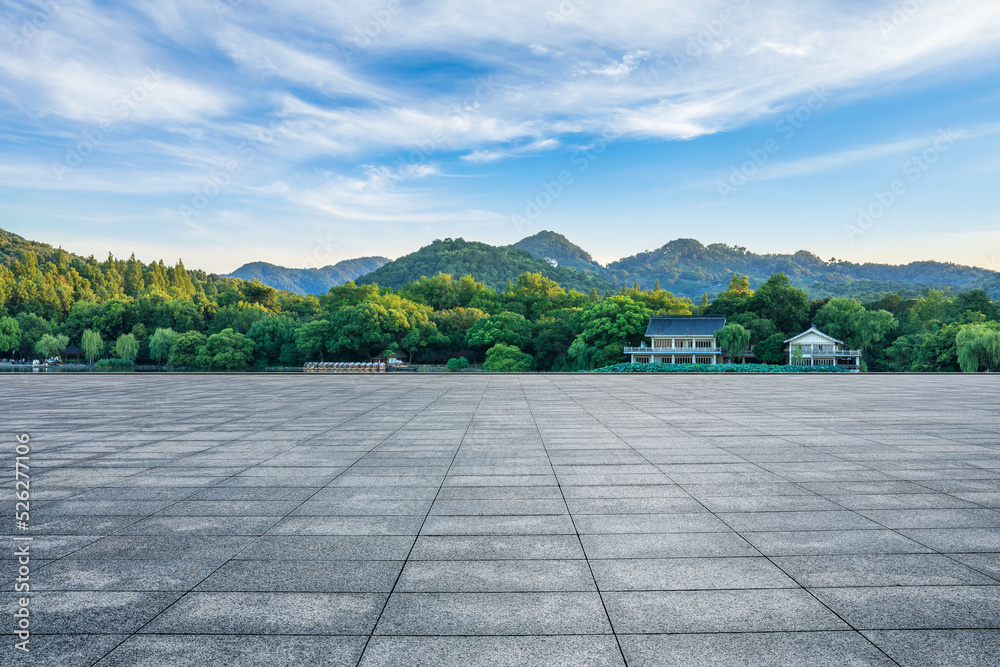 Empty square floor and green forest with mountain scenery in Hangzhou, China.