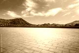 Empty square floor and green mountain scenery