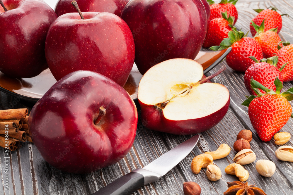 sliced red delicious apple on wood background