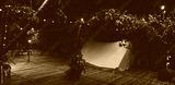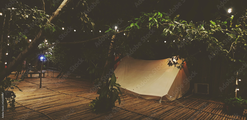 White tent on dry bamboo floor with tree and lighting decorated at night in vintage tone. Camping and activity concept