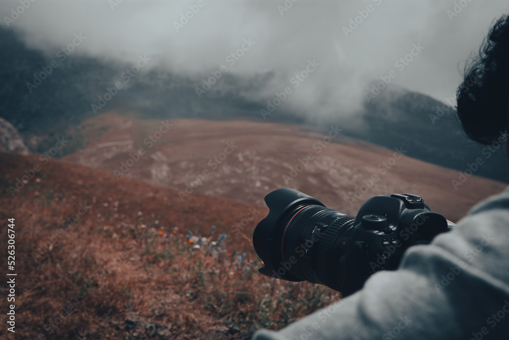 the photographer on the mountain takes a photo