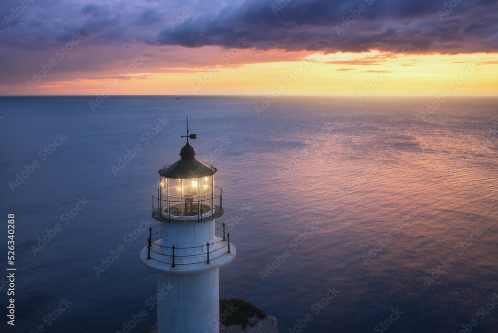 Lighthouse at colorful sunset in summer. Aerial view from drone. Beautiful lighthouse, light, sea and orange sky with purple clouds at night. Top view of Cape Lefkada, Greece. Colorful landscape