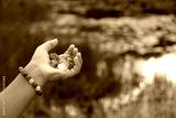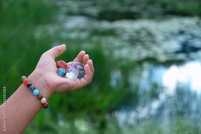quartz crystals chakra set in hand against natural abstract background. Esoteric spiritual practice. Mysticism, wicca occultism concept. Relaxation Witchcraft ritual. Hand with Crystal. copy space