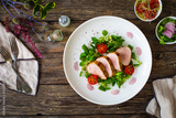 Fried pork loin with fresh vegetables on wooden table