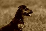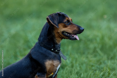 Portrait of a Shorthaired Pinscher in profile on a green background .