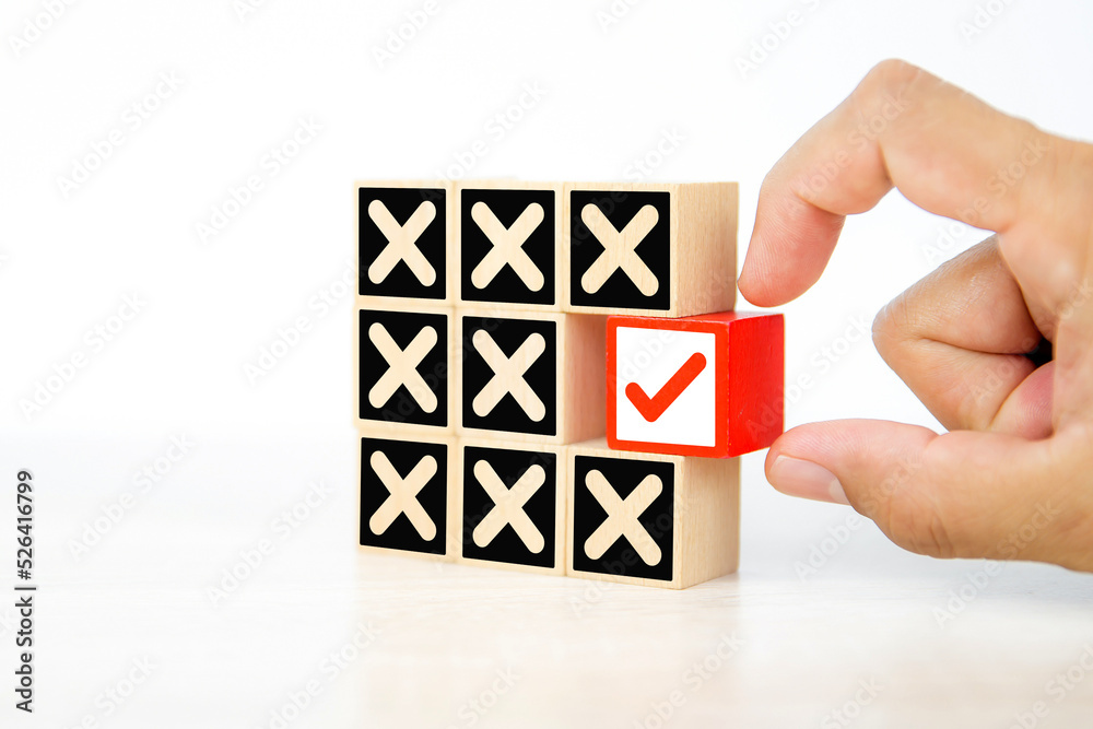 Hand choose check mark on cube wooden toy block with cross symbol for true or false changing mindset or way of adapting to change leader and transform quiz answer and poll concept.