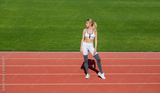 Sportswoman in sportswear. Sportswoman exercising in sport clothing, training, workout. Professional sportswoman during running training session. Woman on stadium track.
