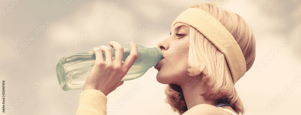 Healthy lifestyle concept. Drinking during sport. Young woman drinking water after run. Sports girl drinks water from a bottle on a sky background
