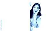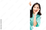 Amazed asian woman hiding behind white wall with blank space isolated on white background Patient girl peeping out a side of white Advertising Board For Text Design or Advertisement Smiling Lady shout