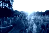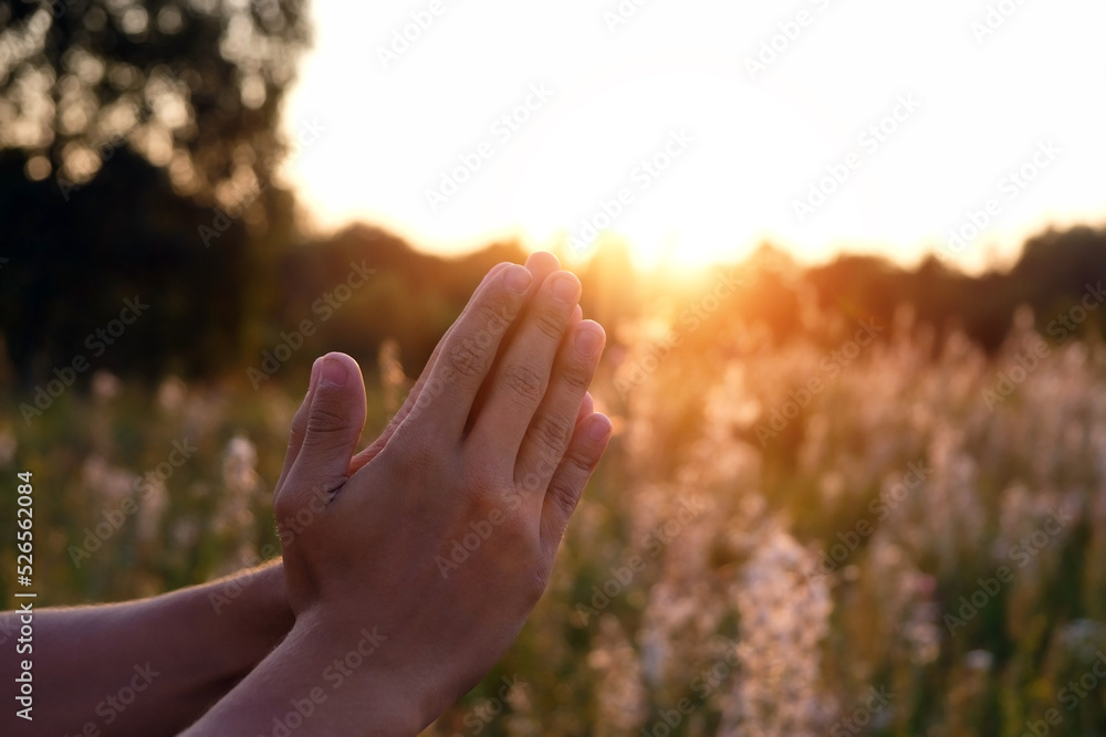 male palms praying and worship against sunny natural blurred background. Blessing, Repent, Help, hope, faith, devotion and Pray of God. Belief in God. Religion, spirituality concept.