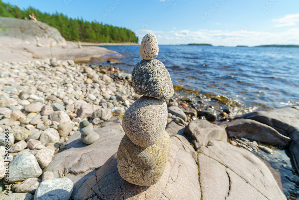Pyramid of stones. Unstable balance of stone objects. Idyllic state of nature.