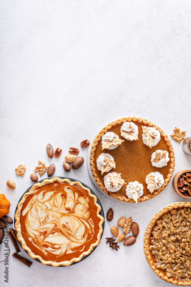 Traditional fall Thanksgiving pies, pumpkin and pecan pie