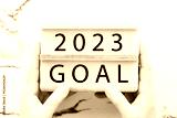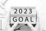 Hands holding 2023 goals wood box over marble background, banner, business new year, aim to success in business