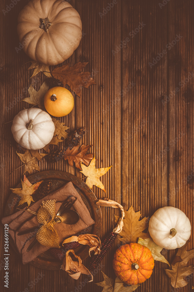 Autumn background with pumpkins, cutlery and golden leaves on a wooden surface