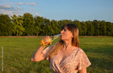 Young pretty girl drinking beer from a bottle outdoor at sunset. Summer holidays and vacation