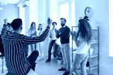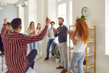 Group of happy school, college or university students together with teacher congratulating young man on his victory in student competition, celebrating success, smiling, applauding and having fun