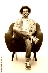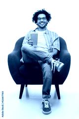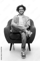 people and furniture concept - happy smiling young man in glasses with popcorn sitting in chair over white background
