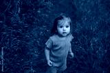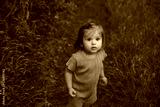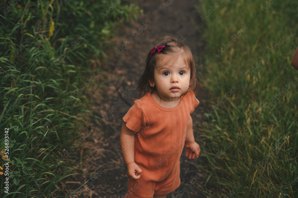 Top view of a caucasian baby girl with brown eyes looking up thoughtfully. Girl looking up. Summer nature. Beautiful young girl.