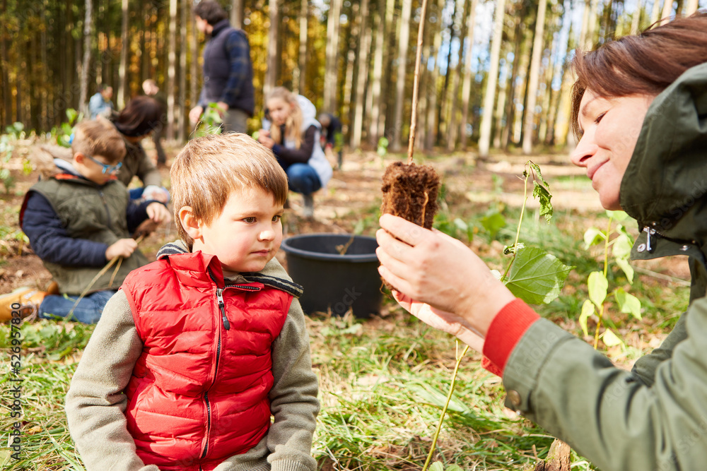 Child and teacher with seedling in tree identification