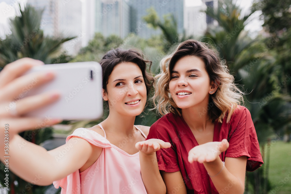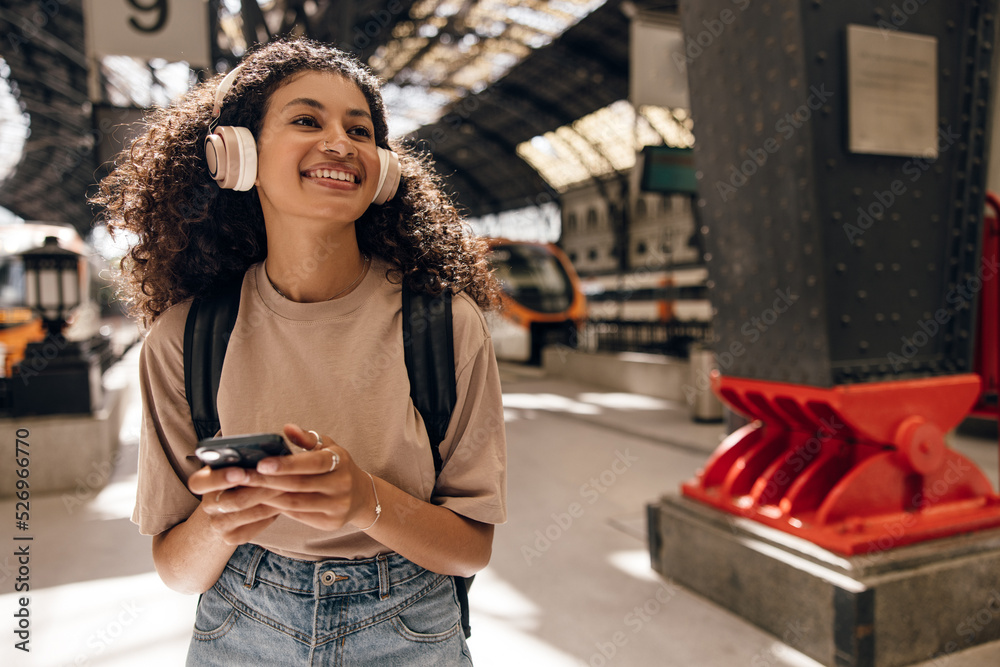 Cheerful young african girl with overhead headphones stands on subway station and use smartphone. Brunette wears t-shirt, jeans skirt and backpack. Concept wireless, gadgets.