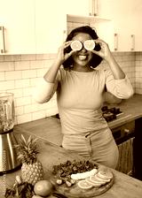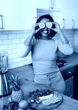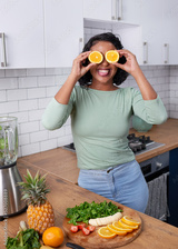 A young multi-ethnic woman holds oranges to her eyes laughing with fruit