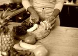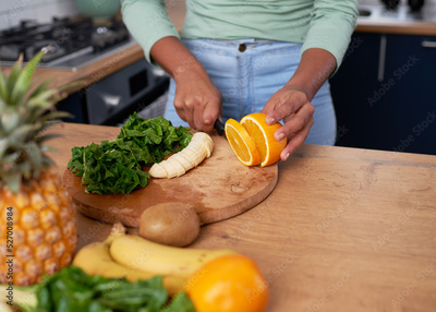 Close up of a young multiracial woman's hands chopping fruit for a smoothie