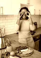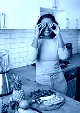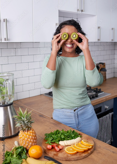 A young multi-ethnic woman holds kiwis to her eyes laughing with fruit