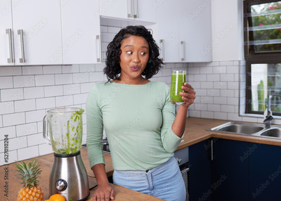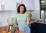 A young multi-ethnic woman looks at her fresh smoothie with expressive eyes