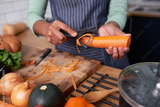 Close up of young woman's hands peeling carrots for vegan soup or stew