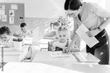 Nice pupils are listening carefully to their tutor. Primary school kids sitting on desks and working in classroom. Female teacher help cute little schoolgirl during lesson.