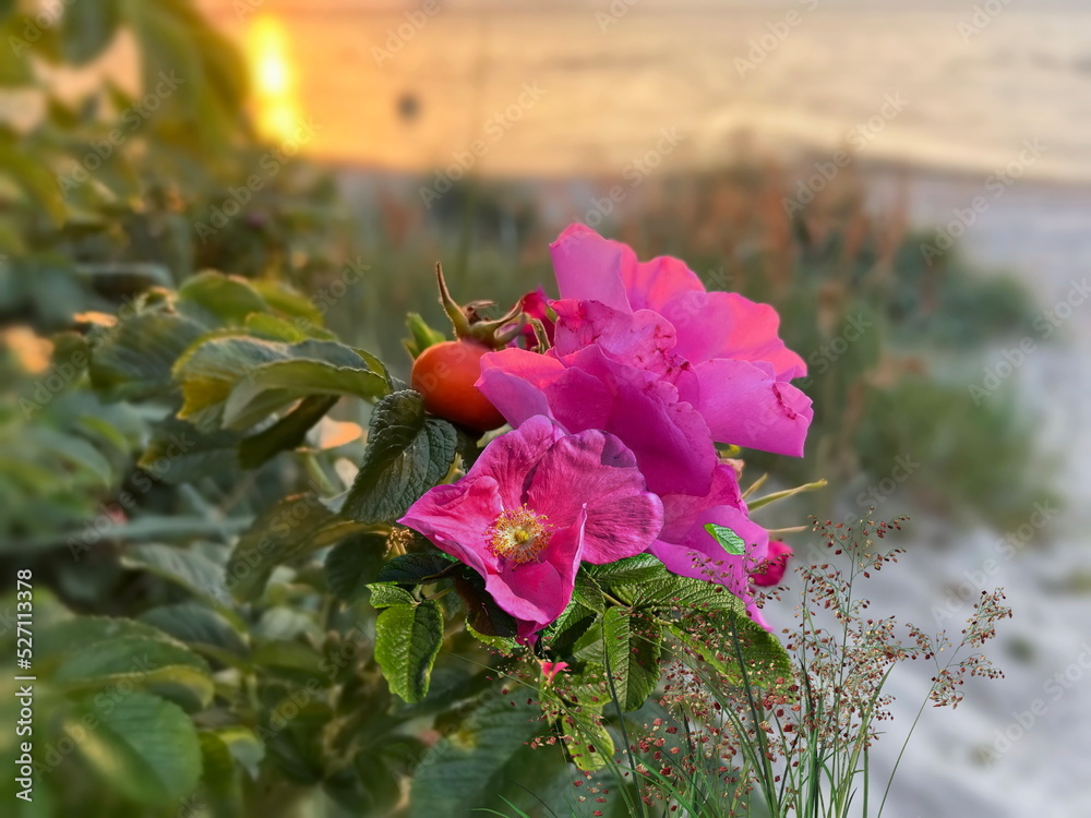 hip roses bush on sunset at beach on Baltic sea nature landscape