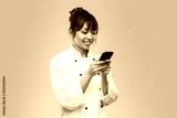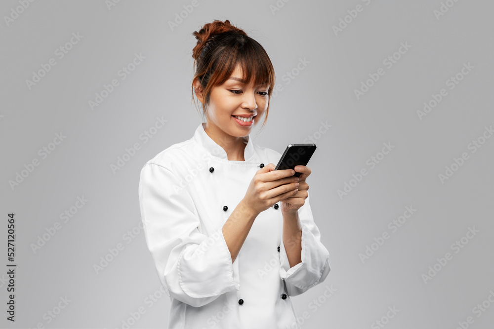 cooking, culinary and people concept - happy smiling female chef in white jacket with smartphone over grey background