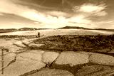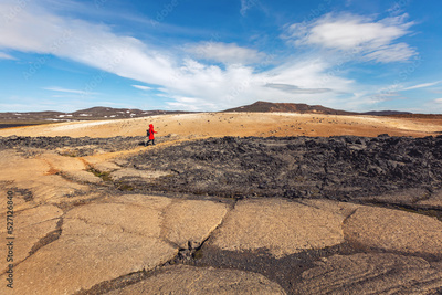 A tourist woman in a red jacket walks along a volcanic plateau in Iceland.