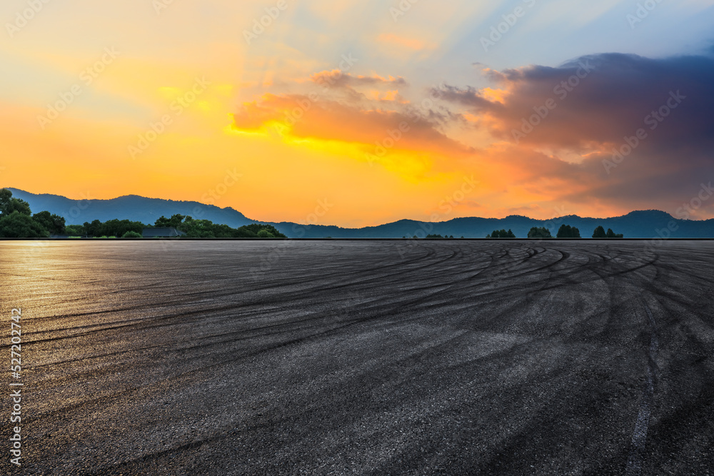 Asphalt road and mountains with beautiful clouds at sunrise